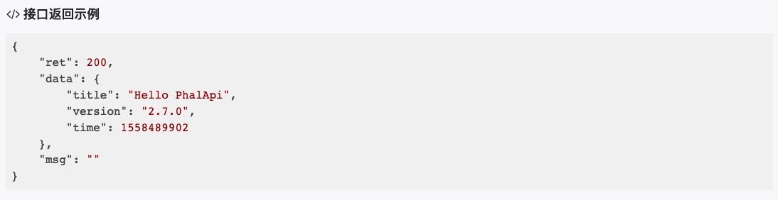 { "ret": 200, "data": { "title": "Hello PhalApi", "version": "2.7.0", "time": 1558489902 }, "msg": "" }