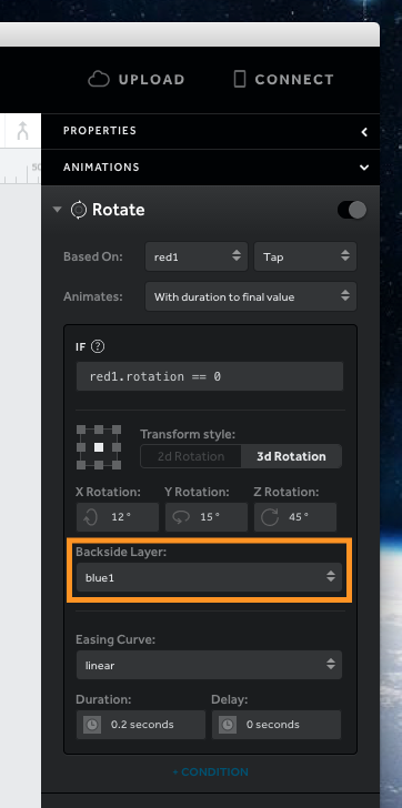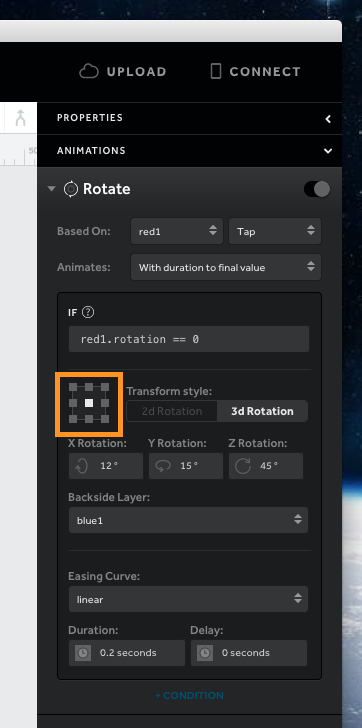 这变化轴可用于切换动画。在默认情况下只显示 Z 轴领域。点击三维旋转显示 X 和 Y 轴。这允许card-flip类型的动画。