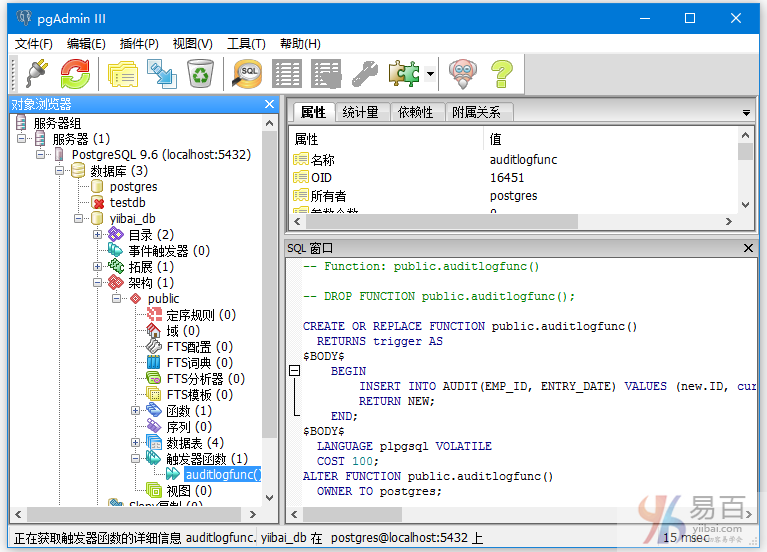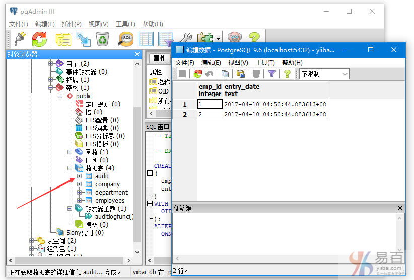 可以确定的是在插入数据后触发了触发器,PostgreSQL也自动向AUDIT