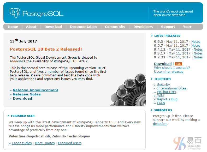 PostgreSQL的官方网站是:https://www.postgresql.org/ 打开如下所示 -