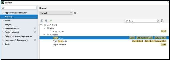 Navigate -> Declaration 打开显示声明,类型声明和定义超级方法。 类型声明中包含的各种属性如下所示 -