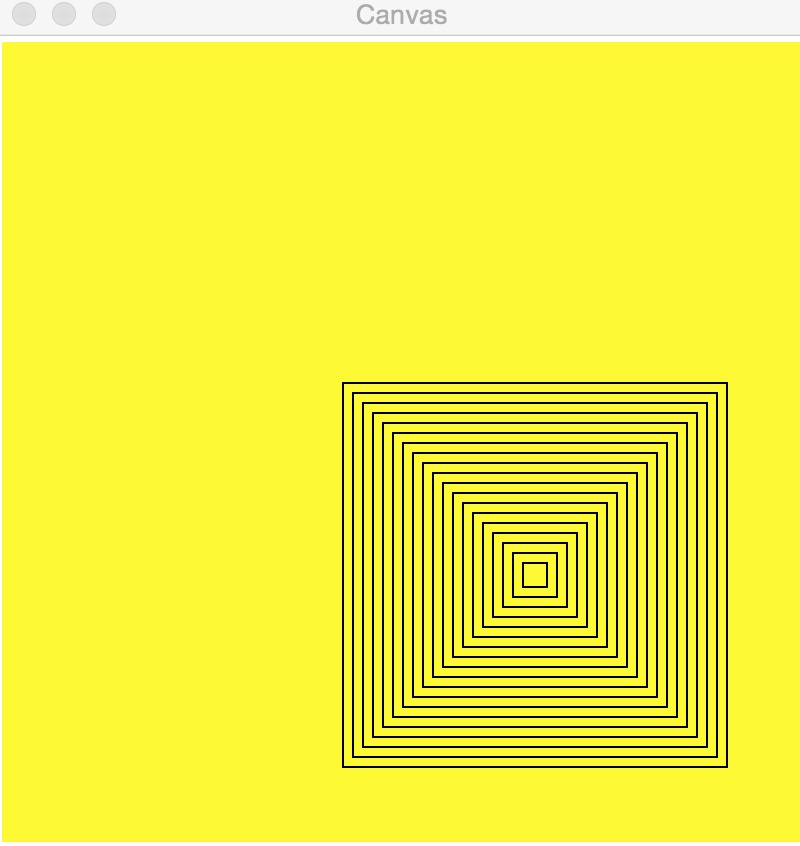 #!/usr/bin/python # -*- coding: UTF-8 -*- if __name__ == '__main__': from Tkinter import * root = Tk() root.title('Canvas') canvas = Canvas(root,width = 400,height = 400,bg = 'yellow') x0 = 263 y0 = 263 y1 = 275 x1 = 275 for i in range(19): canvas.create_rectangle(x0,y0,x1,y1) x0 -= 5 y0 -= 5 x1 += 5 y1 += 5 canvas.pack() root.mainloop()