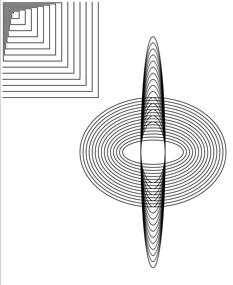 #!/usr/bin/python # -*- coding: UTF-8 -*- if __name__ == '__main__': from Tkinter import * canvas = Canvas(width = 400,height = 600,bg = 'white') left = 20 right = 50 top = 50 num = 15 for i in range(num): canvas.create_oval(250 - right,250 - left,250 + right,250 + left) canvas.create_oval(250 - 20,250 - top,250 + 20,250 + top) canvas.create_rectangle(20 - 2 * i,20 - 2 * i,10 * (i + 2),10 * ( i + 2)) right += 5 left += 5 top += 10 canvas.pack() mainloop()