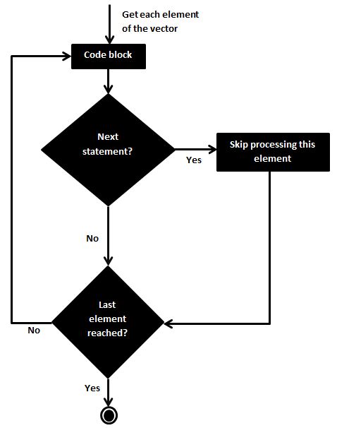 R语言存在next语句,当我们想跳过循环的当前迭代而不终止它时便可使用next。 遇到next时,R解析器跳过本次迭代,并开始循环的下一次迭代。