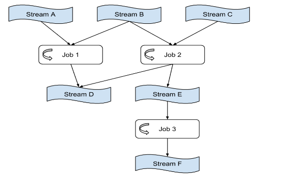 我们可以组合多个作业来创建数据流图,其中边是包含数据的流,并且节点是执行转换的作业。这个组合完全是通过作业作为输入和输出的流完成的。作业完全解耦:它们不需要在相同的代码库中实现,并且添加,删除或重新启动下游作业不会影响上游作业。