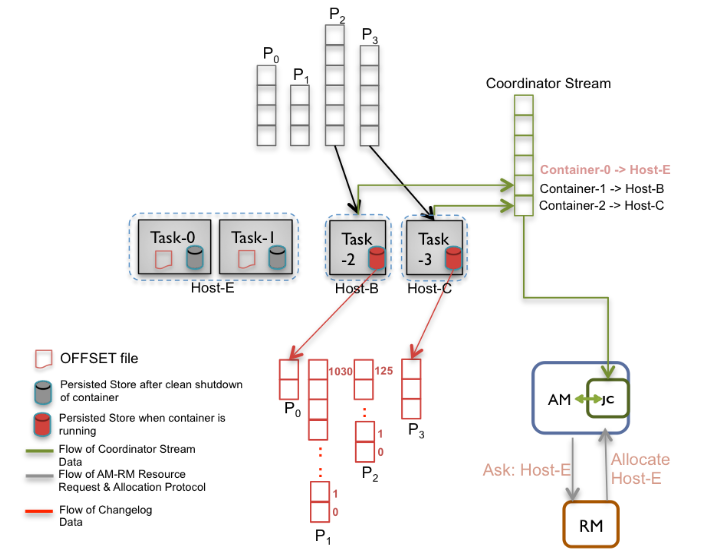 为了重新使用本地状态,Samza 必须从资源管理器(RM)成功地声明特定的主机。为了支持这一点,Samza 容器在每次启动成功时将其地点信息写入协调器流。现在,Samza应用程序主(AM)可以通过作业协调器(JC)识别最后一个已知的容器主机,并且应用程序不再与容器位置无关。在容器故障(由于上述引用的任何原因)中,AM包括ResourceRequest中预期资源的主机名。