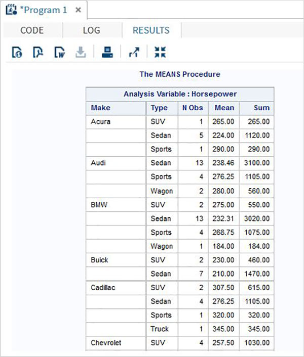 PROC MEANS DATA = sashelp.CARS mean SUM MAXDEC=2; class make type; var horsepower; RUN;
