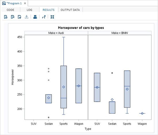 PROC SQL; create table CARS1 as SELECT make,model,type,invoice,horsepower,length,weight FROM SASHELP.CARS WHERE make in ('Audi','BMW') ; RUN; PROC SGPLOT DATA=CARS1; VBOX horsepower / category = type; title 'Horsepower of cars by types'; RUN;