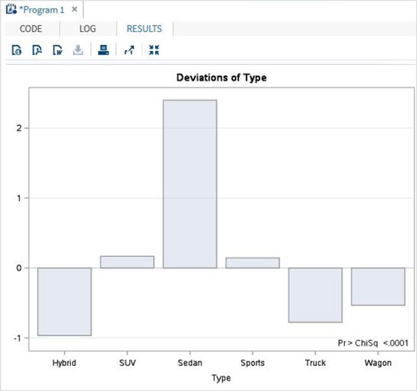 在下面的示例中,我们考虑对数据集SASHELP.CARS中的变量named类型进行卡方检验。 该变量有六个级别,我们根据测试的设计为每个级别分配百分比。