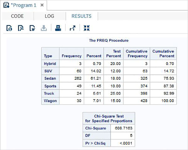 proc freq data = sashelp.cars; tables type /chisq testp=(0.20 0.12 0.18 0.10 0.25 0.15); run;