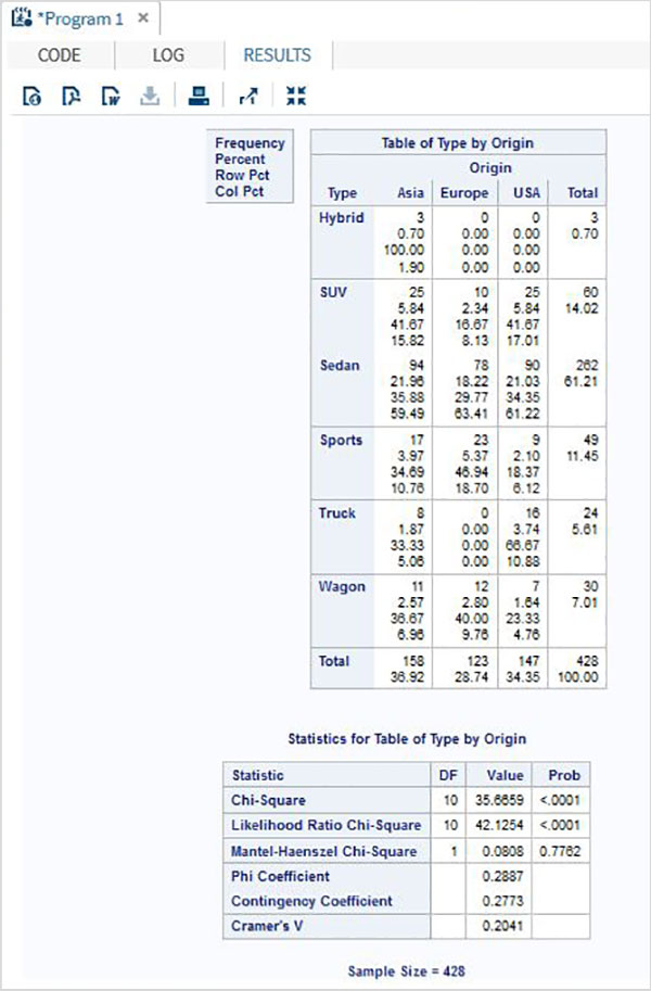 proc freq data = sashelp.cars; tables type*origin /chisq ; run;