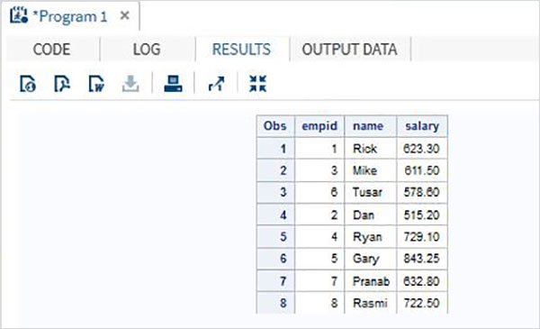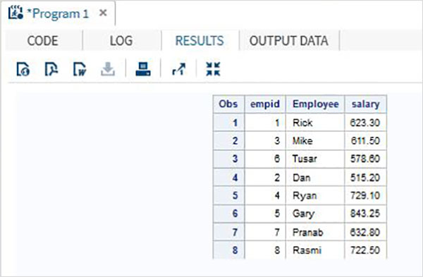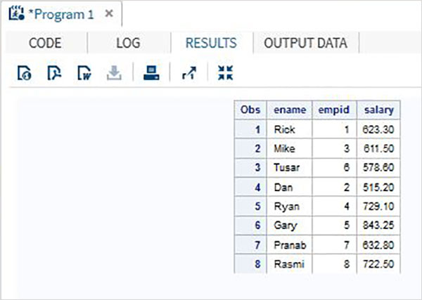 DATA ITDEPT; INPUT empid name $ salary ; DATALINES; 1 Rick 623.3 3 Mike 611.5 6 Tusar 578.6 ; RUN; DATA NON_ITDEPT; INPUT empid name $ salary ; DATALINES; 2 Dan 515.2 4 Ryan 729.1 5 Gary 843.25 7 Pranab 632.8 8 Rasmi 722.5 RUN; DATA All_Dept; SET ITDEPT NON_ITDEPT; RUN; PROC PRINT DATA=All_Dept; RUN;
