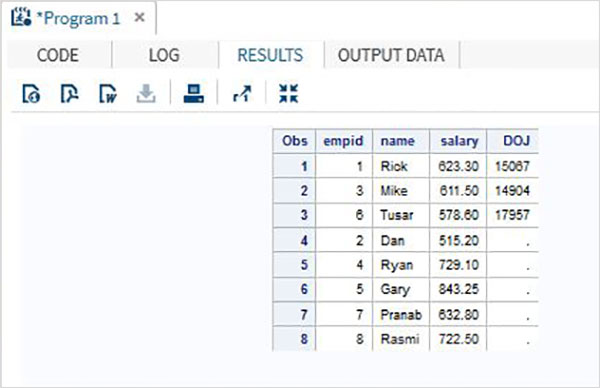 DATA ITDEPT; INPUT empid name $ salary DOJ date9. ; DATALINES; 1 Rick 623.3 02APR2001 3 Mike 611.5 21OCT2000 6 Tusar 578.6 01MAR2009 ; RUN; DATA NON_ITDEPT; INPUT empid name $ salary ; DATALINES; 2 Dan 515.2 4 Ryan 729.1 5 Gary 843.25 7 Pranab 632.8 8 Rasmi 722.5 RUN; DATA All_Dept; SET ITDEPT NON_ITDEPT; RUN; PROC PRINT DATA=All_Dept; RUN;