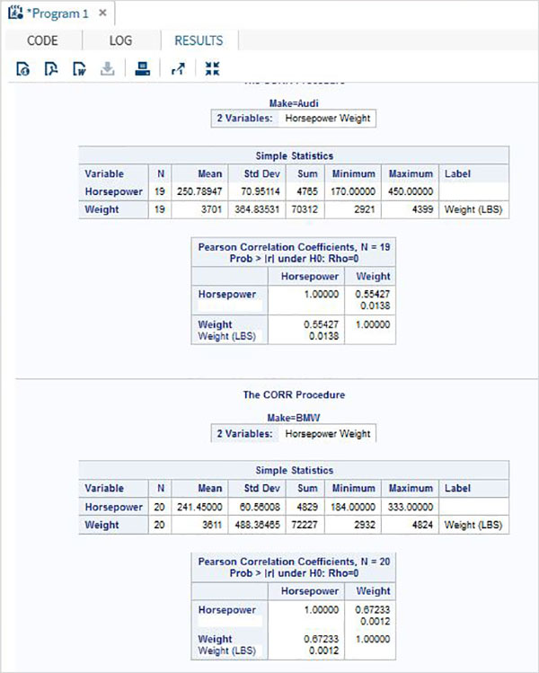 PROC SQL; create table CARS1 as SELECT invoice,horsepower,length,weight FROM SASHELP.CARS WHERE make in ('Audi','BMW') ; RUN; proc corr data=cars1 ; VAR horsepower weight ; BY make; run;