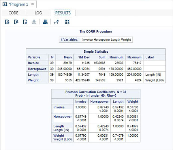 在下面的例子中,我们使用数据集CARS1并获得显示每对变量之间的相关系数的结果。