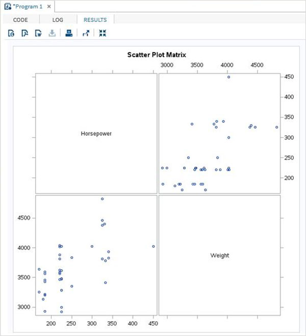 proc corr data=cars1 plots=matrix ; VAR horsepower weight ; run;