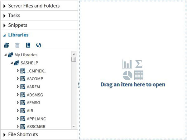 这些数据集已在已安装的SAS软件中提供。 它们可以被探索并用于形成用于数据分析的样本表达式。 要探索这些数据集,请转到库 - >我的库 - > SASHELP。 在展开时,我们可以看到所有内置数据集的名称列表。