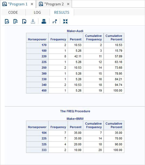 PROC SQL; create table CARS1 as SELECT make,model,type,invoice,horsepower,length,weight FROM SASHELP.CARS WHERE make in ('Audi','BMW') ; RUN; proc FREQ data=CARS1 ; tables horsepower; by make; run;