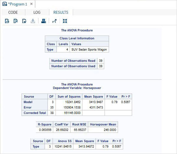 PROC ANOVA DATA = SASHELPS.CARS; CLASS type; MODEL horsepower = type; RUN;