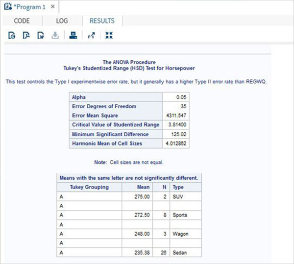 PROC ANOVA DATA = SASHELPS.CARS; CLASS type; MODEL horsepower = type; MEANS type / tukey lines; RUN;