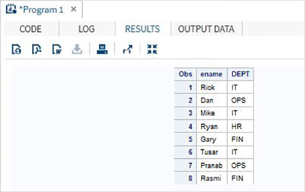 DATA Employee; INPUT empid ename $ salary DEPT $ ; DATALINES; 1 Rick 623.3 IT 2 Dan 515.2 OPS 3 Mike 611.5 IT 4 Ryan 729.1 HR 5 Gary 843.25 FIN 6 Tusar 578.6 IT 7 Pranab 632.8 OPS 8 Rasmi 722.5 FIN ; RUN; DATA OnlyDept; SET Employee; KEEP ename DEPT; RUN; PROC PRINT DATA=OnlyDept; RUN;