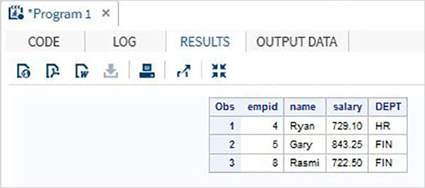 考虑包含组织的员工详细信息的以下SAS数据集。 如果我们只想获得薪水超过700的员工的数据,那么我们使用以下代码。