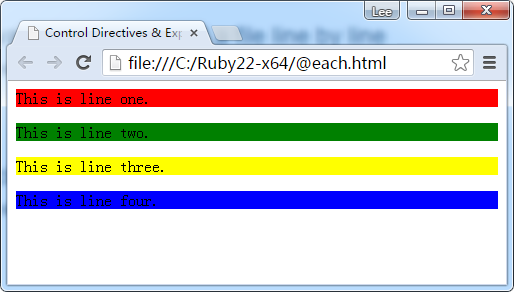 <html> <head> <title>Control Directives & Expressions</title> <link rel="stylesheet" type="text/css" href="style.css"/> </head> <body> <p class="p_red">This is line one.</p> <p class="p_green">This is line two.</p> <p class="p_yellow">This is line three.</p> <p class="p_blue">This is line four.</p> </body> </html>