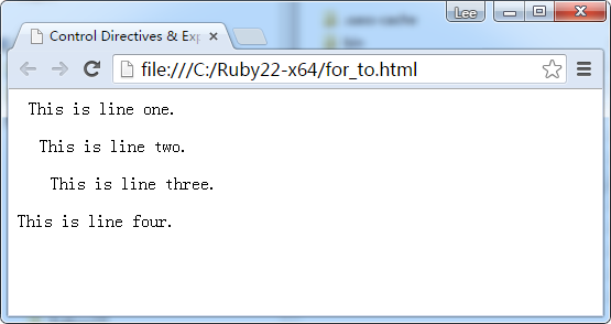 <html> <head> <title>Control Directives & Expressions</title> <link rel="stylesheet" type="text/css" href="style.css"/> </head> <body> <p class="p1">This is line one.</p> <p class="p2">This is line two.</p> <p class="p3">This is line three.</p> <p class="p4">This is line four.</p> </body> </html>