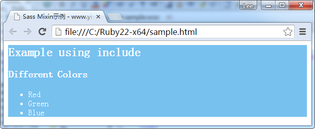 <html> <head><meta charset="utf-8"> <title>Sass Mixin 示例</title> <link rel="stylesheet" type="text/css" href="sample.css"/> </head> <body> <div class="cont"> <h2>Example using include</h2> <h3>Different Colors</h3> <ul> <li>Red</li> <li>Green</li> <li>Blue</li> </ul> </div> </body> </html>