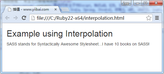 <html> <head> <title>插值 - www.bootwiki.com</title> <link rel="stylesheet" type="text/css" href="style.css" /> <link rel="stylesheet" href="https://maxcdn.bootstrapcdn.com/bootstrap/3.3.5/css/bootstrap.min.css"> <script src="https://ajax.googleapis.com/ajax/libs/jquery/2.1.3/jquery.min.js"></script> <script src="https://maxcdn.bootstrapcdn.com/bootstrap/3.3.5/js/bootstrap.min.js"></script> </head> <body> <div class="container"> <h2>Example using Interpolation</h2> <p>SASS stands for Syntactically Awesome Stylesheet...</p> </div> </body> </html>