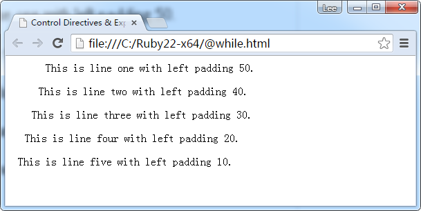 <html> <head> <title>Control Directives & Expressions</title> <link rel="stylesheet" type="text/css" href="style.css"/> </head> <body> <p class="paddding-50">This is line one with left padding 50. </p> <p class="paddding-40">This is line two with left padding 40.</p> <p class="paddding-30">This is line three with left padding 30. </p> <p class="paddding-20">This is line four with left padding 20. </p> <p class="paddding-10">This is line five with left padding 10. </p> </body> </html>