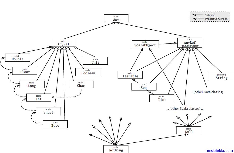 在这张图的最下方我们可以看到有两个类,scala.Null 和 scala.Nothing。 这两个类的作用是 Scala 支持统一方式用来处理面向对象的一些边角情况。因为它们在类层次图的下方,因此也称为底层类型。