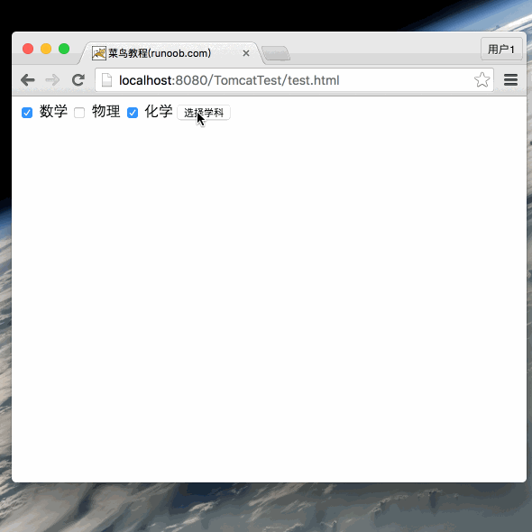 <!DOCTYPE html> <html> <head> <meta charset="utf-8"> <title>外唐教程网(waitang.com)</title> </head> <body> <form action="ReadParams" method="POST" target="_blank"> <input type="checkbox" name="maths" checked="checked" /> 数学 <input type="checkbox" name="physics" /> 物理 <input type="checkbox" name="chemistry" checked="checked" /> 化学 <input type="submit" value="选择学科" /> </form> </body> </html>