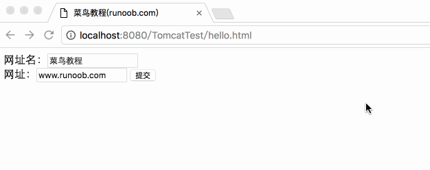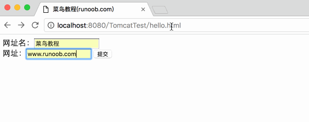 <!DOCTYPE html> <html> <head> <meta charset="utf-8"> <title>外唐教程网(waitang.com)</title> </head> <body> <form action="HelloForm" method="GET"> 网址名:<input type="text" name="name"> <br /> 网址:<input type="text" name="url" /> <input type="submit" value="提交" /> </form> </body> </html>