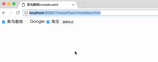<!DOCTYPE html> <html> <head> <meta charset="utf-8"> <title>外唐教程网(waitang.com)</title> </head> <body> <form action="CheckBox" method="POST" target="_blank"> <input type="checkbox" name="runoob" checked="checked" /> 外唐教程网 <input type="checkbox" name="google" /> Google <input type="checkbox" name="taobao" checked="checked" /> 淘宝 <input type="submit" value="选择站点" /> </form> </body> </html>