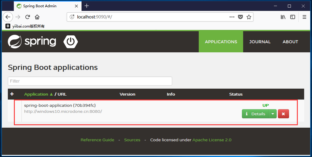 现在,从Web浏览器访问以下URL,应该能看到Spring Boot应用程序已在Spring Boot Admin Server中注册。