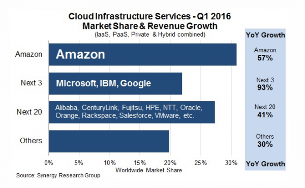 亚马逊的云计算基础设施市场份额超过了2016年初微软,IBM和谷歌的累计市场份额。
