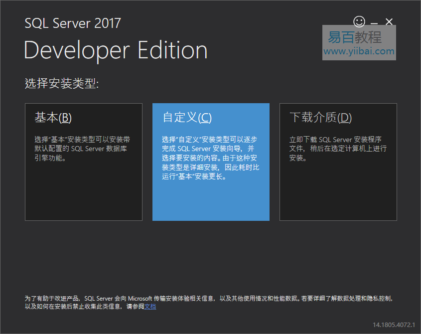 安装程序会要求您选择安装类型,选择“自定义”安装类型可以单步执行SQL Server安装向导并选择要安装的功能。