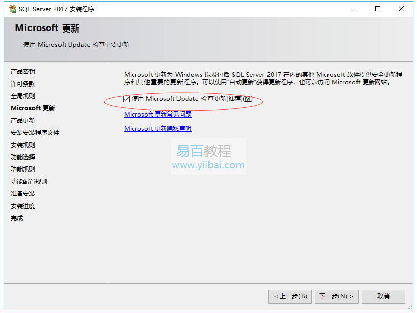 选中“使用Microsoft Update检查更新(推荐)” 以获取SQL Server的安全性和其他重要更新,然后单击“下一步” 按钮。