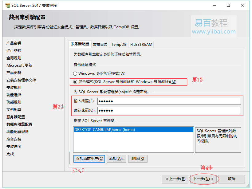 指定数据库引擎安全模式。 首先,选择混合模式。 接下来,输入SQL Server系统管理员(sa)帐户的密码(这里使用:123456)。 然后,重新输入相同的密码进行确认。 之后,单击“添加当前用户”按钮。 最后,单击“下一步”按钮。