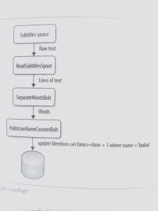 想像播音员读的字幕作为你的数据输入流。你可以用一个 spout 读取一个文件(或者 socket,通过 HTTP,或者别的方法)。文本行被 spout 传给一个 bolt,再被 bolt 按单词切割。单词流又被传给另一个 bolt,在这里每个单词与一张政治人名列表比较。每遇到一个匹配的名字,第二个 bolt 为这个名字在数据库的计数加1。你可以随时查询数据库查看结果, 而且这些计数是随着数据到达实时更新的。所有组件(spouts和bolts)及它们之间的关系请参考拓扑图1-1