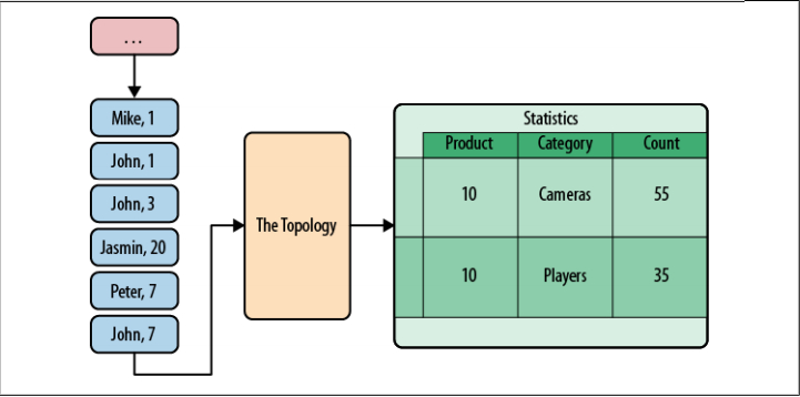 为这个系统搭建 Storm 拓扑的目标是改进产品统计的实时性。产品统计页显示了一个分类计数器列表,用来显示访问了其它同类产品的用户数。这样可以帮助卖家了解他们的用户需求。拓扑接收浏览日志,并更新产品统计结果