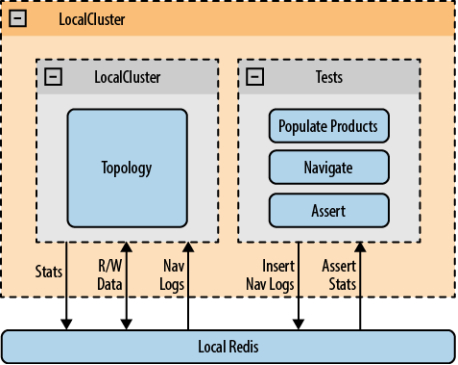 使用 LocalCluster 和一个本地 Redis 服务器执行测试。向 Redis 填充产品数据,伪造访问日志。我们的断言会在读取拓扑向 Redis 输出的数据时执行。测试用户用 java 和 groovy 完成。