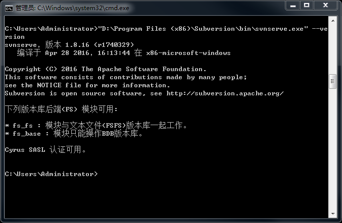 把svn安装目录里的bin目录添加到path路径中,在命令行窗口中输入 svnserve --help ,查看安装正常与否。