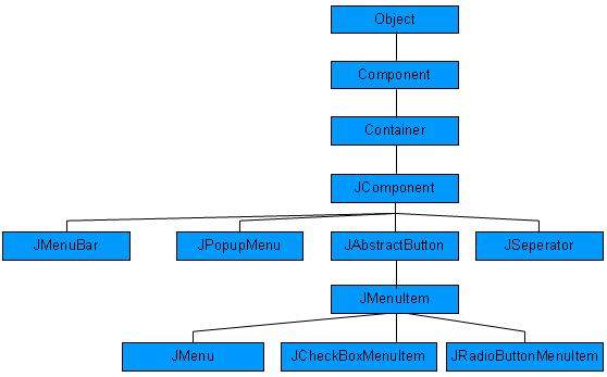 正如我们所知道每个顶层窗口有一个菜单栏与它相关联。这个菜单栏包括各种菜单可用的选择给最终用户。而且每个选择包含被称为下拉菜单的选项列表。菜单和菜单项的控件都是 MenuComponent 类的子类。