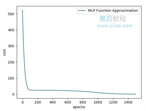 plt.plot(errors,label='MLP Function Approximation') plt.xlabel('epochs')