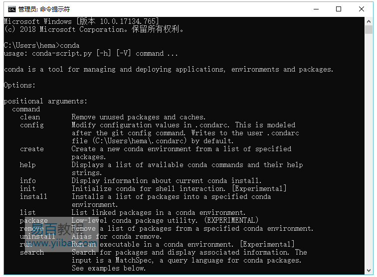 安装成功后,通过conda命令检入命令提示符。命令执行如下 -