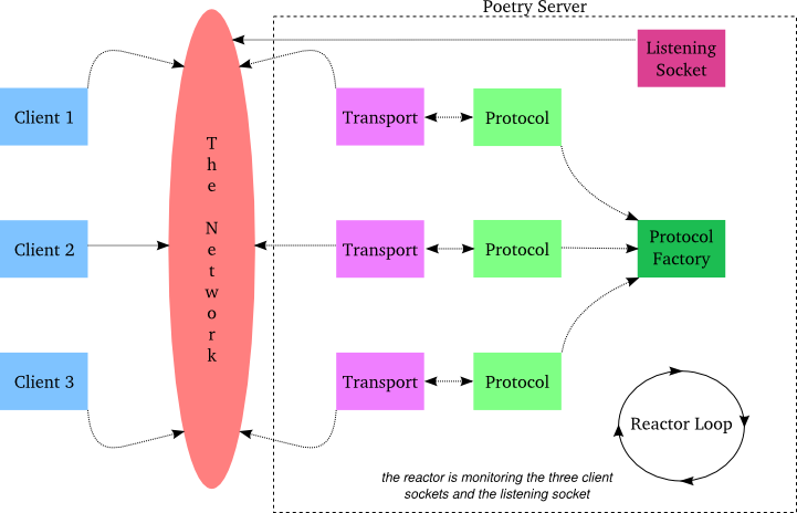 在图中,有三个客户端连接到服务器。每个Transport代表一个client socket,加上listening socket总共是四个被select循环监听的文件描述符(file descriptor).当一个客户端断开与其相关的transport的连接时,对应的PoetryProtocol也会被解引用并当作垃圾被回收。而PoetryFactory只要我们还在监听新的连接就会一直不停地工作(即PoetryFactory不会随着一个连接的断开导致的PoetryProtocol的销毁而销毁)。