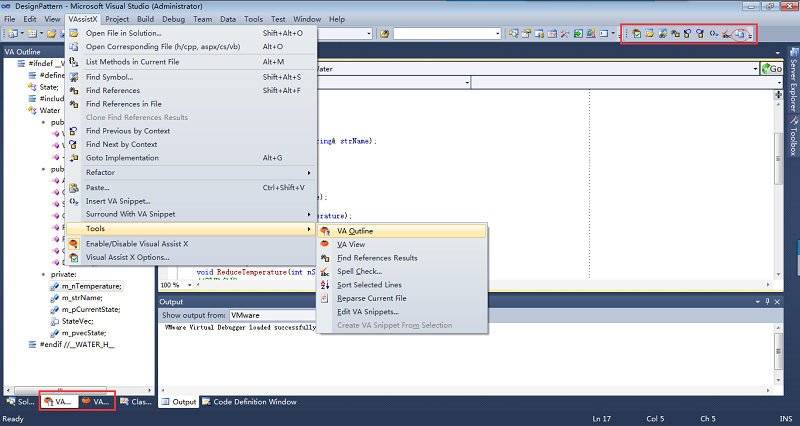 插件成功安装之后,菜单栏会多一个 VassistX 的菜单,这里包含了 VassistX 的所有功能和相关的设置,设置方面后面还会进一步讲。 左侧会有两个 VA Outline 和 VA View 视图(如果没有,可能菜单 VassistXToolsVA Outline 调出来)。VA Outline 这个视图很有用,也是我用的最多的一个视图,它能清晰地呈现一个类中的各个成员。 工具栏也会多一个 VassistX 工具组。这个我用的最多的要数最右边的 .h 与.cpp 的切换按钮。