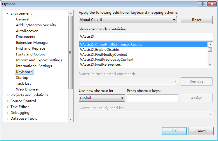 菜单 ToolsOption…,然后在打开的对话框中选择 Keyboard,Show commands containning 中输入 VAssistX 就能看到 VAssistX 的各种功能,你可以设置某一指定功能的快捷键。如你输入 VAssistX.refactorRename,就能看到重命名的默认快捷键是 Shift+Alt+R,你在 Press shortcut keys 中按下快捷键更改它。